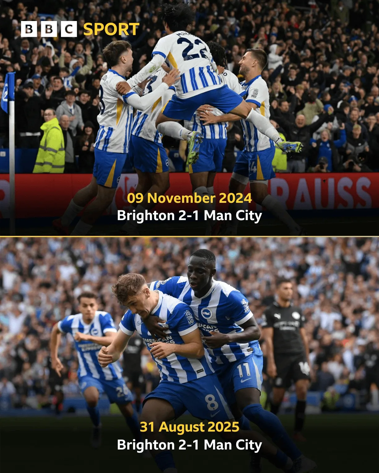 去年曼城在输给布莱顿后又在主场被热刺零封输球,今年则是主场被热刺零封输球后再输给布莱顿;
